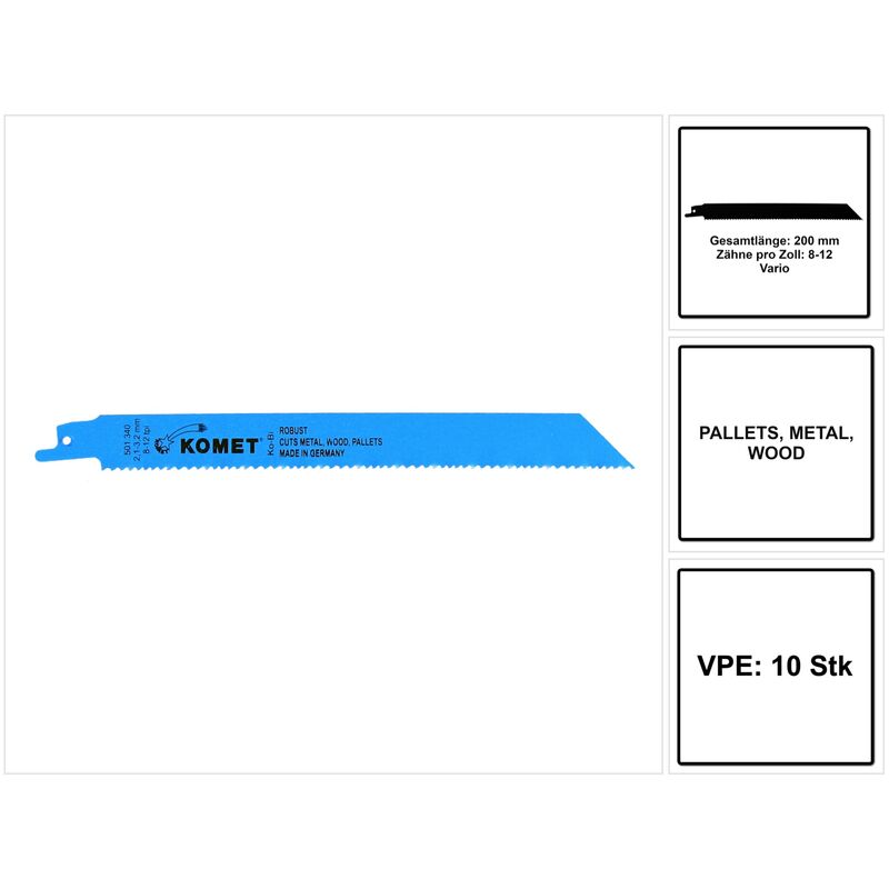 Dotazione: - 10x Komet PALLETS Lama da taglio 200mm 8-12tpi ( 2x 501.340 ) HSS-Bi-Metall Vario Descrizione prodotto: La lama della Komet è una lama robusta che è adatta per lavorare su metallo, legno e pallet. La lama di alta qualità è fatta di metallo temprato (BImetallo) ed è quindi progettata per carichi estremi. La geometria del dente, lo spessore di 1,27 mm e la lunghezza di 150 mm permettono eccellenti tagli a filo del materiale. Ogni punta del dente è fatta di acciaio HSS trattato termicamente ed è quindi estremamente resistente ed enormemente potente. La forma del dente Vario riduce le vibrazioni e permette tagli morbidi attraverso il materiale. Il passo dei denti di 2,1/3,2 mm permette anche di tagliare i chiodi morbidi. L'eccellente qualità delle lame Komet prodotte in Germania è rigorosamente controllata. Dati tecnici: Materiale: HSS BI-Metall Lunghezza: 200 mm Spessore: 1,27 mm Larghezza: 19 mm Denti per pollice: 8-12 Disposizione dei denti: Limitazione di gruppo