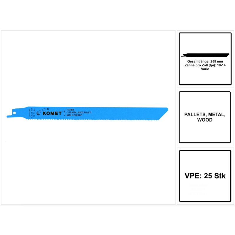 Dotazione: - 25x Komet PALLETS Lama da taglio 225mm 10-14tpi ( 5x 501.400 ) HSS-Bi-Metall Vario Descrizione prodotto: La lama flessibile della Komet è adatta per materiali metallici e legno. La lama di alta qualità è fatta di metallo temprato (BImetallo) ed è quindi progettata per carichi estremi e sollecitazioni di flessione alternate. Ha una speciale punta inversa che impedisce l'inceppamento e la perforazione nel legno. La flessibilità della lama copre la gamma di applicazioni in cui sono necessarie lame flessibili. La forma del dente Vario Tooth riduce le vibrazioni e permette tagli morbidi attraverso il materiale. Ogni punta dei denti è fatta di acciaio HSS temprato e temperato ed è quindi estremamente resistente ed enormemente potente. Il passo dei denti di 1,8-2,5 mm permette anche di tagliare i chiodi morbidi. L'eccellente qualità delle lame Komet prodotte in Germania è rigorosamente controllata. Dati tecnici: Materiale: HSS BI-Metall Lunghezza: 225 mm Spessore: 0,90 mm
