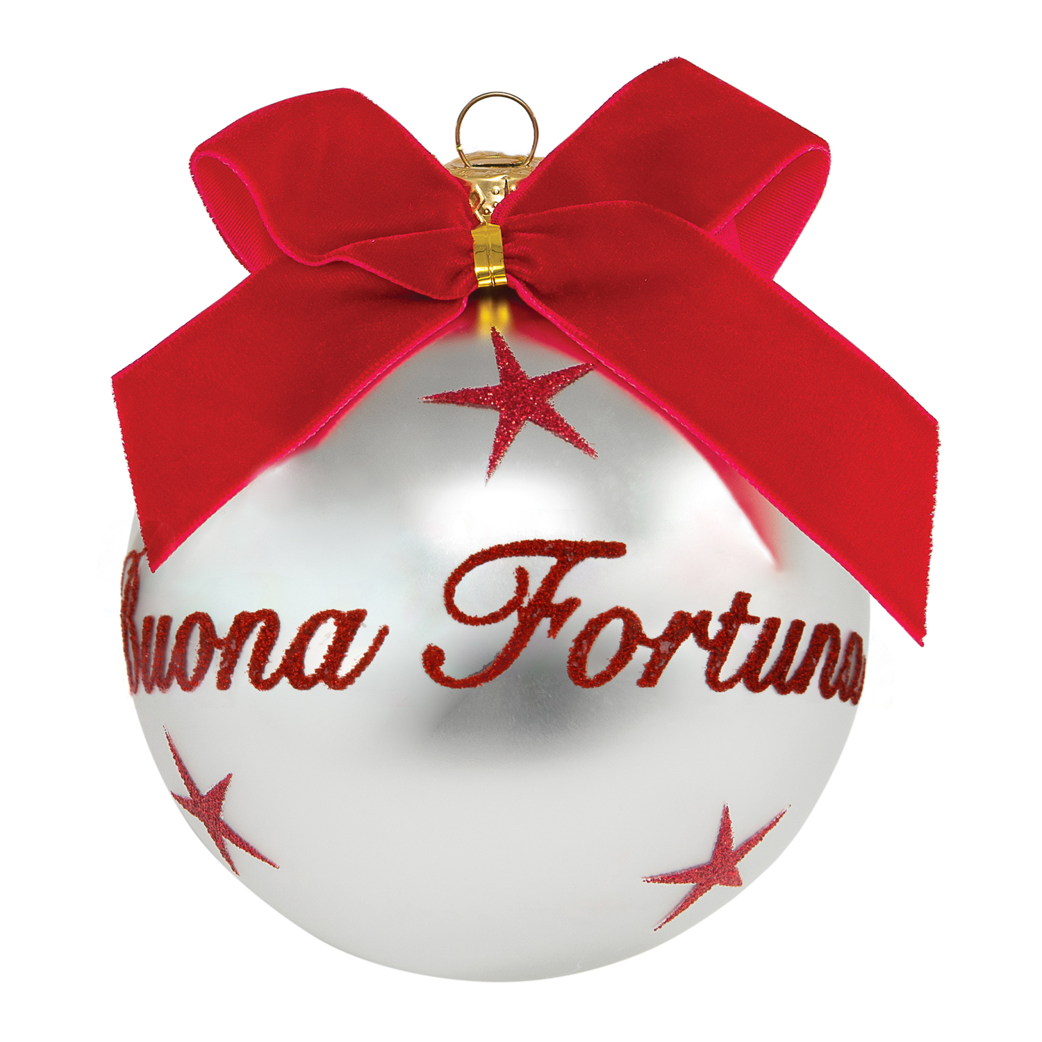 La collezione di palline Natale in vetro, con grafica creata dalla designer Benny Setti, è il perfetto regalo da fare ad amici e parenti. Completa di scritta "Buona fortuna", è confezionata in una graziosa scatola regalo e presenta un bel fiocco tartan sui toni del rosso, scritta rossa e fiocchi dorati sul vetro. Potrai appenderla sui rami dell'abete tramite il pratico nastrino e posizionarla sulla tavola per arricchire il centrotavola durante le cene in famiglia. Diametro: 10 cm.