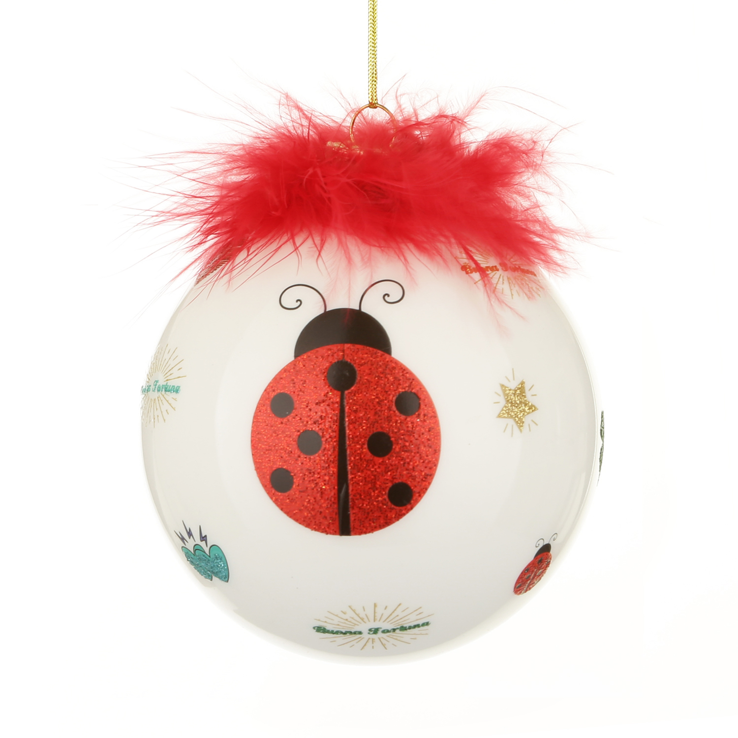 A Natale regala e regalati un po' di fortuna con la nuova collezione di palline Good Luck della designer Benny Setti. Realizzata in vetro, sarà un prezioso e colorato portafortuna da donare ad amici, colleghi o parenti e perfetto per decorare con originalità l'albero di Natale. La pallina, con le sue piume rosse, il decoro di coccinella e le scritte buona fortuna, non passerà di certo inosservata appesa sul tuo albero di Natale. Perfetta anche come segnaposto originale sulla tua tavola delle feste. La pallina è già confezionata in elegante scatola, pronta da regalare. Collezionala insieme alle altre palline della linea. Diametro: 10 cm.