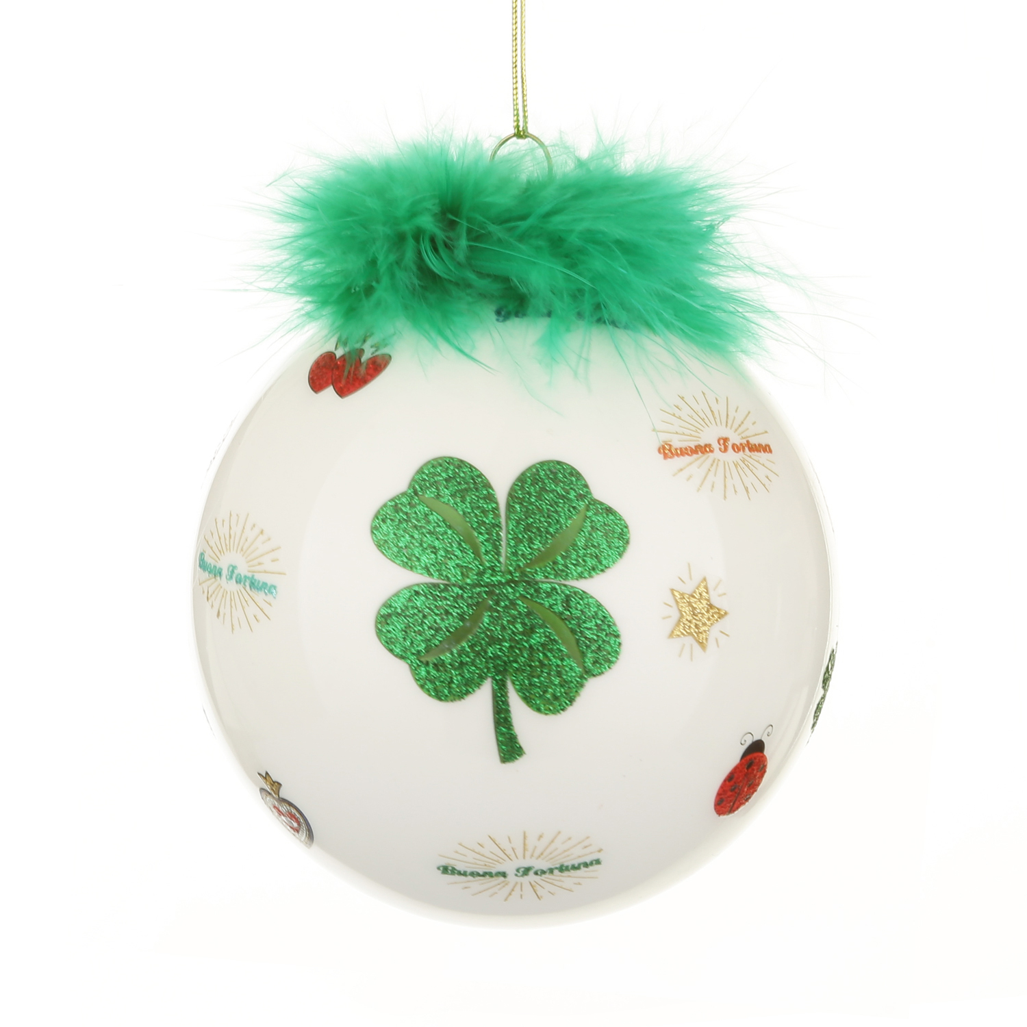 A Natale regala e regalati un po' di fortuna con la nuova collezione di palline Good Luck della designer Benny Setti. Realizzata in vetro, sarà un prezioso e colorato portafortuna da donare ad amici, colleghi o parenti e perfetto per decorare con originalità l'albero di Natale. La pallina, con le sue piume verdi, il decoro di quadrifoglio e le scritte buona fortuna, non passerà di certo inosservata appesa sul tuo albero di Natale. Perfetta anche come segnaposto originale sulla tua tavola delle feste. La pallina è già confezionata in elegante scatola, pronta da regalare. Collezionala insieme alle altre palline della linea. Diametro: 10 cm.