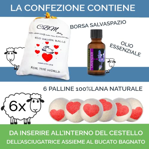 6 Palline per Asciugatrice di Lana con olio essenziale di Lavanda profuma il tuo bucato,formato XXL da 7CM,ammorbidente naturale riduce tempo di asciugatura bucato, riutilizzabili CBM Italy