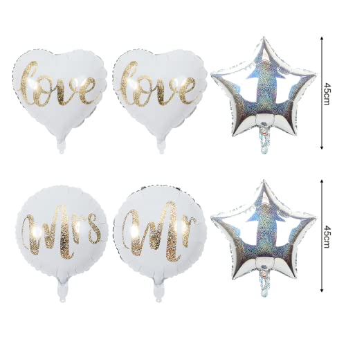 2 × palloncini da 18" con pentagramma laser argento, 1 × palloncino argentato con monogramma LOVE, 1 × palloncino da 88x64 cm per lo sposo, 1 × palloncino da 88x64 cm per la sposa, 2 × palloncini da 18" LOVE love, 1 × palloncino rotondo da 18" MRS, 1 × palloncino rotondo da 18" MR, cannuccia e nastro argentato.