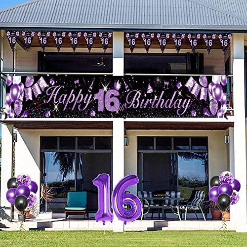 Kit decorativo per 16 compleanni: include 1 striscione nero brillante viola oro, palloncino in pellicola da 32 pollici numero 16, 11 bandierine viola oro 21 x 15 cm, 6 palloncini viola in metallo da 12 pollici, 6 palloncini neri e 6 palloncini viola da 12 pollici, una corda da 13 piedi e il nostro servizio clienti amichevole. (Dimensioni striscione: 274*37 cm/9*1.21 Piedi)