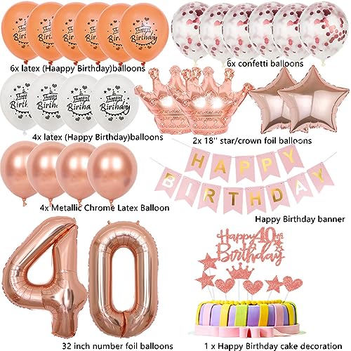 40 Anni compleanno decorazioni in oro rosa: 1 set di striscione di Happy Birthday, 2 palloncini in foil a forma di stella da 18 inch, 2 palloncini in foil a forma di corona da 18 inch, 2 palloncini in foil digitali da 32 inch, 6 palloncini a coriandoli da 12 inch in oro rosa, 6 palloncini in lattice da 12 inch in oro rosa di Happy Birthday, 4 palloncini in lattice da 12 inch in bianco di Happy Birthday, 4 palloncini metallici, 1 nastro, 1 set di decorazioni per torta di Happy Birthday.