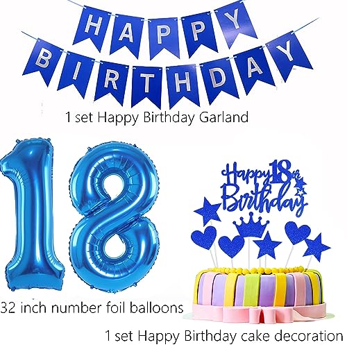 18° compleanno ragazzo/uomo di decorazioni per il Set: 1 set di striscione blu "Happy Birthday", 2 palloncini in foil cuore d'amore da 18'', 2 palloncini in foil stella da 18'', 2 palloncini in foil digitali blu da 32'', 6 palloncini coriandoli da 12'', 6 palloncini in lattice blu da 12'', 6 palloncini in lattice blu da 12''1 nastro da 1 set cake topper Happy Birthday.