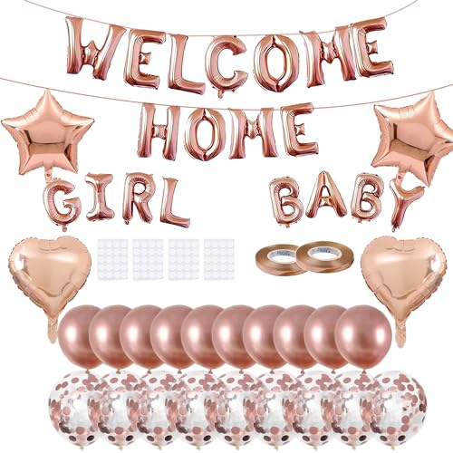 Palloncini Baby Shower Ragazze, WELCOME HOME BABY GIRL Decorazioni Benvenuto, Lettere ad Elio Palloncini con Oro Rosa Coriandoli Palloncino Lattice Palloncini Foil Palloncino per Baby Shower Ragazza