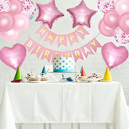【Set di decorazioni di compleanno】 1 banner per feste di buon compleanno, 5 pezzi di palloncini di coriandoli rosa e bianchi, 5 palloncini rosa chiaro, 5 palloncini rosa scuro, 2 palloncini stella rosa, 2 palloncini cuore rosa, 2 nastri per palloncini, 100 punti adesivi per punti di colla.