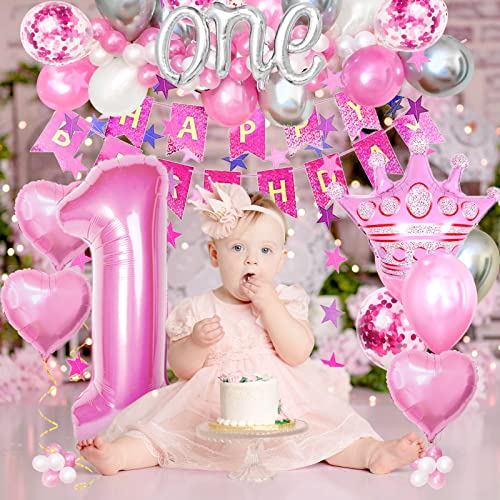Primo Compleanno Bambina: Palloncini compleanno 1 anno,facile da installare,decorazione di tema di compleanno di 1 anno rosa ragazza di 1 anno,con tutti gli elementi di compleanno a tema rosa, amore,corona,stelle,splendere palloncini luminosi,creano assolutamente un'impressionante festa di compleanno a tema rosa