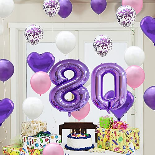 Palloncini per 80° compleanno, 80° compleanno, decorazioni per festa di compleanno 80° compleanno, colore viola con numero 80 in alluminio, palloncini in lattice per ragazze, ragazzi, donne, uomini