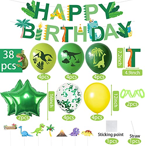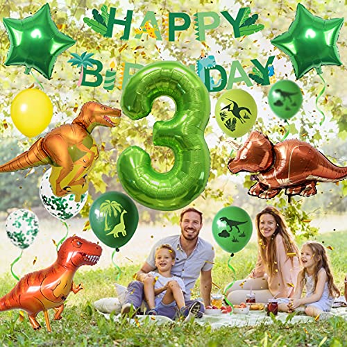 [38 Dinosaur Birthday Set] Il set di compleanno di dinosauro di 3 anni si basa su elementi di dinosauro, tra cui 1 ghirlanda di buon compleanno di dinosauro, 1 palloncini di alluminio XXL digitali 3, 3 palloncini di stagnola di dinosauro, 2 palloncini di stagnola di stelle verdi, 12 palloncini stampati di dinosauri, 4 palloncini gialli opachi, 4 palloncini coriandoli verdi, 7 decorazioni per torta a tema dinosauri, 2 nastri verdi, 1 punto colla e 1 cannuccia.