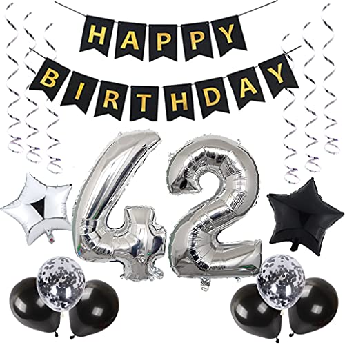 42° festa di compleanno, colore nero e argento: include palloncini in pellicola digitale da 32 pollici + ghirlanda Happy Birthday + 4 palloncini in lattice + 2 palloncini + 2 palloncini a forma di stella (18 pollici) + decorazioni da appendere (6 confezioni)