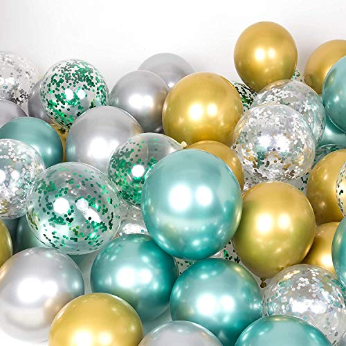 50 palloncini in lattice di colore verde giallo argento metallizzati, con coriandoli verde argento e argento, ideali per decorazioni di matrimonio