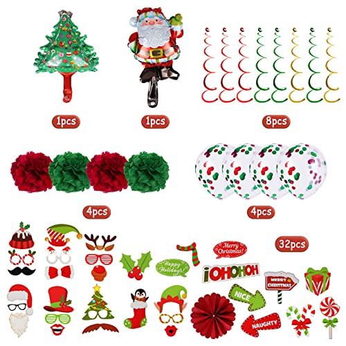 【Decorazione con Palloncini per Feste di Natale】 1 set di 32 oggetti di scena per foto natalizie, 1 palloncino cartone animato albero di Natale, 1 palloncino cartone animato Babbo Natale, palloncini stampati 12 * 12 pollici, palloncini 4 * 12 pollici con paillettes rosse e verdi, rosso 2 * 8 pollici e palline di fiori di carta verde, 1 set di 8 spirali natalizie, 1 set di striscioni con lettere natalizie, 1 * bandiera dell'albero di Natale in pile, 1 confezione di nappe natalizie rosse e verdi