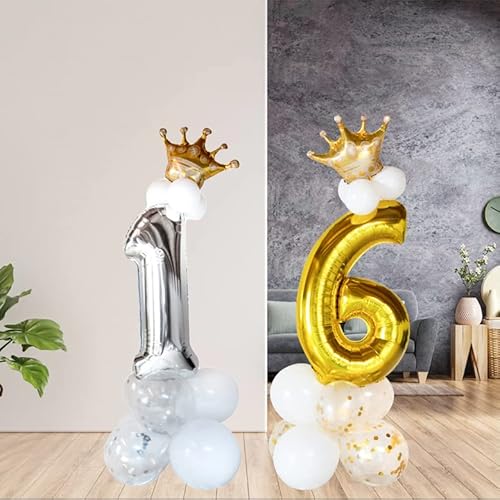 KIT COMPLETO: All'interno troverai un kit compleanno composto da un numero alto 80 cm, 4 palloncini 12 pollici che sono circa 30 cm, 3 palloncini 10 pollici che sono circa 25 cm, 3 palloncini 5 pollici che sono circa 12 cm, una corona da 20 cm, una cannuccia per gonfiare il numero e della colla a punti per assemblare la tua composizione.
