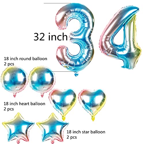 Palloncini con numero 34 di compleanno, decorazione da donna con numeri arcobaleno, numero 34, palloncini + cuore in pellicola a elio, per 34 anni, decorazione per le donne