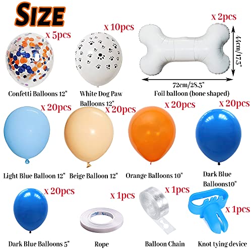 1. Kit di palloncini e strumenti: (117 pezzi) include palloncini arancioni, blu scuro, azzurri, beige, palloncini bianchi con zampa di cane, palloncini di coriandoli, palloncini di alluminio a forma di osso. 16 piedi di corda per palloncini, annodatore e 1 rotolo di nastro adesivo.