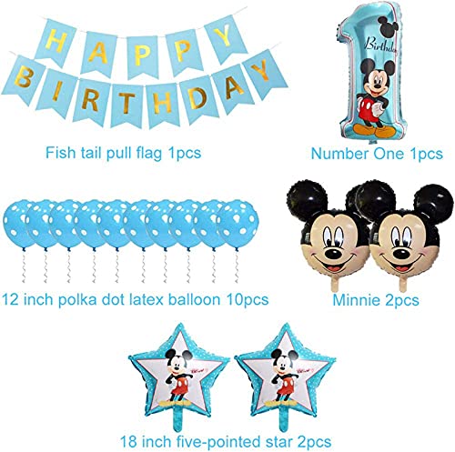 Kit di decorazioni per feste di Topolino: la confezione contiene 1 set di striscioni di buon compleanno, 1 palloncino foil numero 1, 2 palloncini foil Topolino, 10 palloncini in lattice blu, 2 stelle a cinque punte, 1 bandiera a coda di pesce, 1 nastro (blu, azzurro).