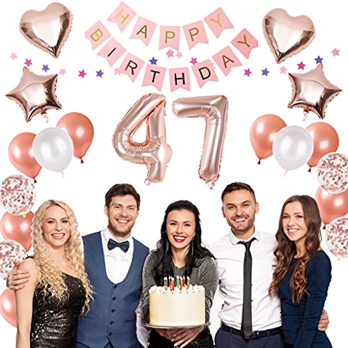DECORAZIONE 47° COMPLEANNO ORO ROSA: contiene palloncini foil "47" digitali da 32 pollici + ghirlanda di buon compleanno + 10 palloncini in lattice + 4 palloncini coriandoli + 2 palloncini foil a cuore (18 pollici) + 2 palloncini foil a stella (18 pollici) + decorazione da appendere a stella (4 metri)