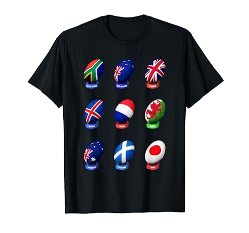 Caratterizzato da bandiere dei paesi con forti squadre di rugby come il Sud Africa, Nuova Zelanda, Inghilterra, Islanda, Francia, Giappone e Australia, questo è un grande camicia da indossare durante le finali di rugby. Grande regalo per gli appassionati d