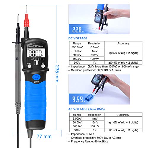 【Precisione e alta precisione】 Multimetro digitale a penna, tester di tensione per misurare con precisione la tensione CA / CC: 6 V ~ 600 V, Tensione CC: 600 m V ~ 600 V, tester di resistenza da 1 Ω ~ 60 MΩ, test diodi e cicalino di continuità.