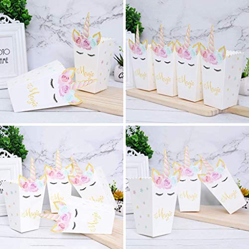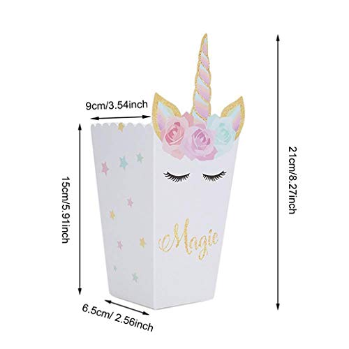 Oggetto dell'accessorio: viene fornito con 12 scatole di popcorn con motivi Unicorn in una combinazione, che misura circa 3,54 × 2,56 × 8,27 pollici, quantità sufficiente a soddisfare le tue necessità.