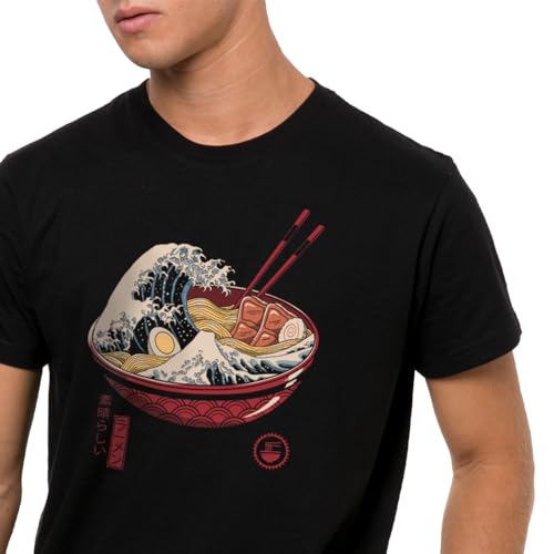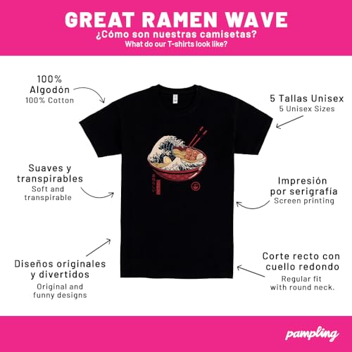 Pampling Maglietta Manica Corta in 100% Cotone, Abbigliamento Unisex per Uomo e Donna in 5 Taglie, T-Shirt Nera, Modello Great Ramen Wave (XXL)
