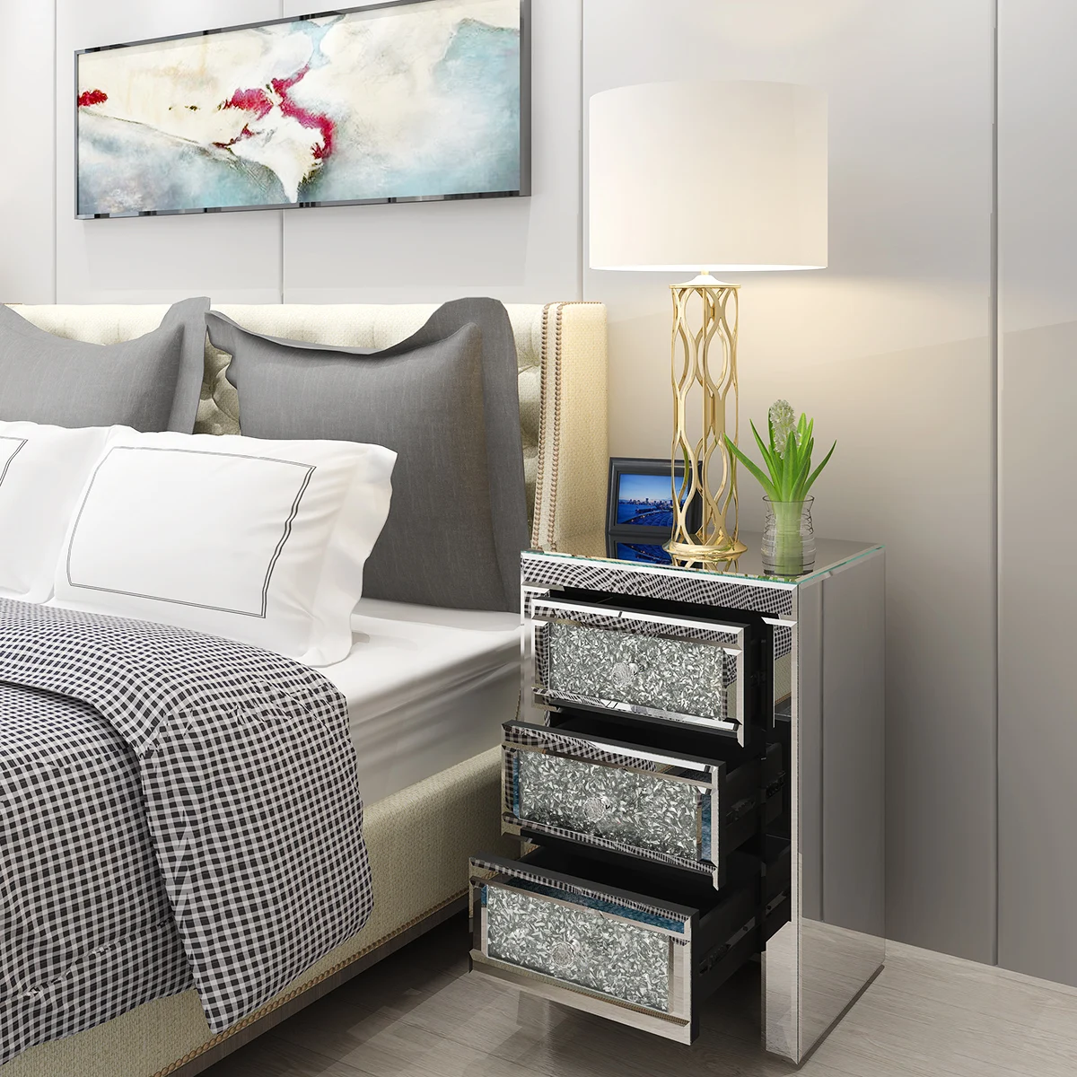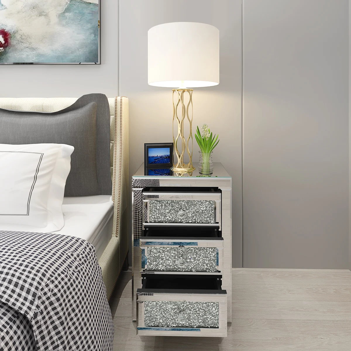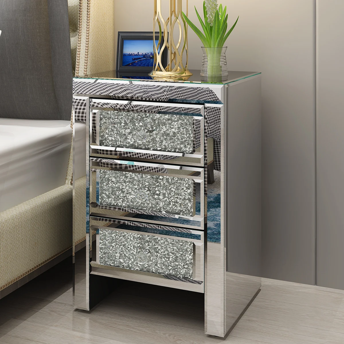 Panana Mirrored Crystal Glass Bedside Table 3 Drawer Bedroom Cabinet Nightstand Fast delivery