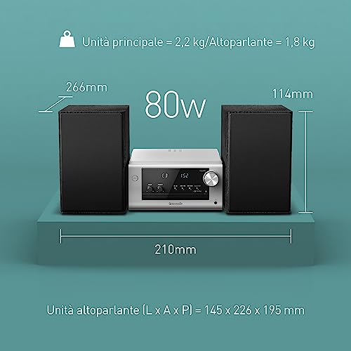 SUONO POTENTE E CHIARO: Grazie alla tecnologia Sound Remastering e ai diffusori a 2 vie da 80 W con woofer da 10 cm e tweeter da 6 cm, questo impianto hi-fi offre un suono potente e chiaro per tutte le esigenze audio.