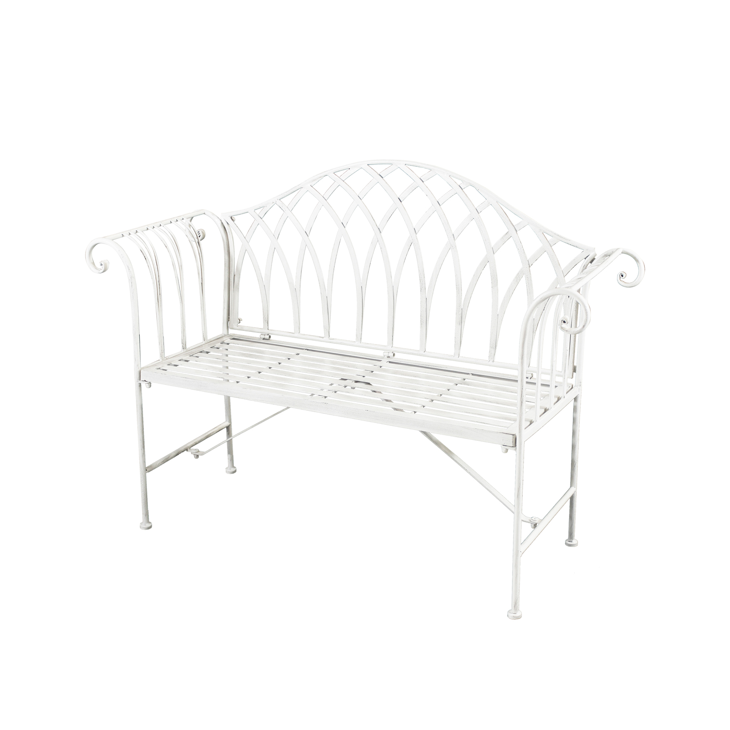 Aggiungi un tocco shabby chic al tuo arredo giardino con questa graziosa panca in metallo. La lavorazione dello schienale e dei braccioli sporgenti la rende davvero irresistibile e darà qual tocco elegante e curato ai tuoi spazi all'aperto. Potrai riposarti in giardino, chiaccherare sul terrazzo o prendere il sole comodamente seduto. La verniciatura con trattamento di elettroforesi, a basso impatto ambientale, garantisce una copertura totale e un'ottima resistenza alla corrosione, oltre a un bellissimo colore bianco antico. Portata massima: 200 kg. Dimensioni: 128x93x40 cm.