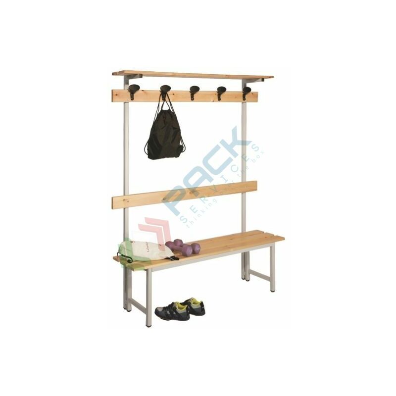 PANCHE PER SPOGLIATOIO CON DOGHE IN LEGNO, SCHIENALE, ATTACCAPANNI E CAPPELLIERA Panche per spogliatoio realizzate con struttura portante in tubo dacciaio 30 x 30 x 15 mm e piano con doghe in legno. Panchine per spogliatoio complete di schienale alzata con attaccapanni cappelliera superiore. Gambe con puntali in gomma, seduta realizzata con 3 doghe in legno, bordi smussati, verniciate al naturale dimensioni mm. 100 x 20. Trattamento delle superfici: a mezzo fosfato di ferro pesante, processo di preparazione alla verniciatura che avviene per mezzo di deposizione di polveri epossidiche. Reticolazione a forno a 180°C. Materiale fornito in kit di montaggio. Caratteristiche tecniche: Doghe con bordi smussati e verniciate al naturale Articolo fornito smontato in colli di cartone Colore di serie struttura: Grigio RAL 7035 Accessori/ personalizzazioni: Colorazione struttura: RAL 1018, 2009, 3000, 3003, 9016, 5017, 6018, 7039 Kit porta scarpe inferiore Cerificazioni: UNI 12720:2009 resistenza