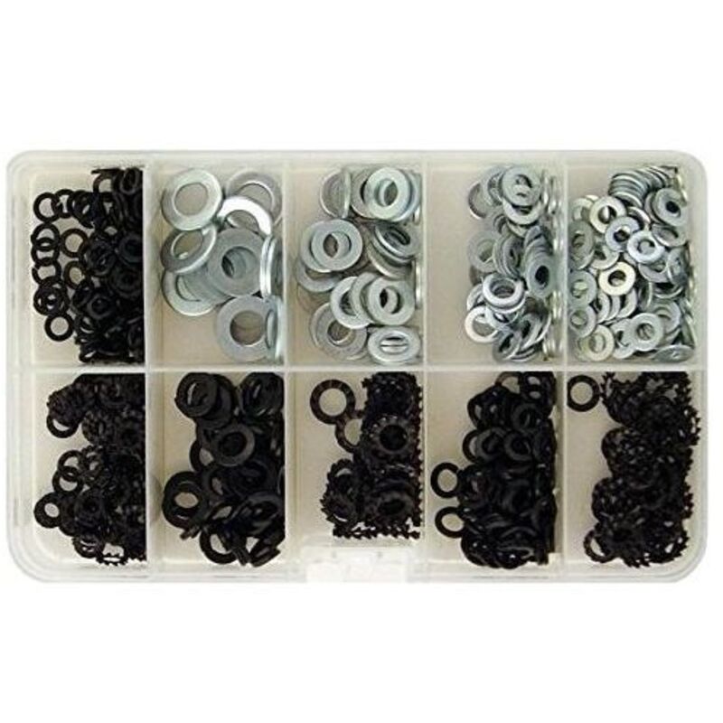 Assortimento di rondelle piane, dentate e grower.