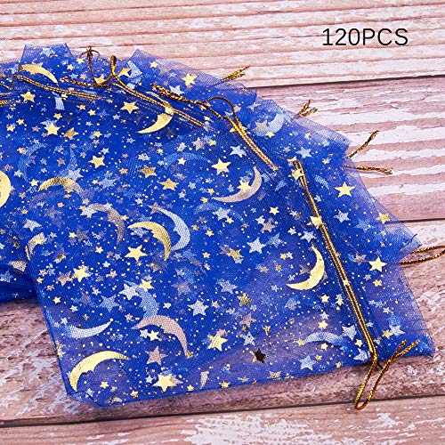 PandaHall 120pz Sacchetti di Organza Luna e Stella 9x12cm Sacchetti bomboniere Blu Sacchetti di Gioielli con Coulisse per Confetti Battesimo Festa di Nozze Candy Creazione di Gioielli