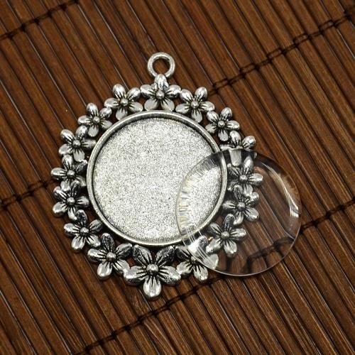 PandaHall 5 Set 25mm Cabochon Vetro Ciondoli per Collane Basi Ciondoli Portafoto Forma Fiore, Senza Cadmio & Nichel & Piombo, Argento Antico, Ciondoli: 49x41mm, Foro: 2mm, Vassoio: 25mm