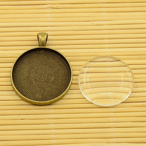 PandaHall 10 Set 30mm Cabochon Vetro Ciondoli per Collane Bracciali Cupola Trasparente e Basi Ciondoli, Stile Tibetano, Bronzo Antico, Ciondolo:41x32x4mm, Foro: 2mm, Vassoio:30mm, Vetro:30x8mm