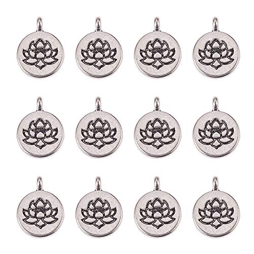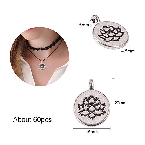 PandaHall 60pcs 15mm Stile Tibetano ciondoli di Loto Pendenti Piatte in Lega di Fiori Pendenti Argento Antico per collane monili Che Fanno