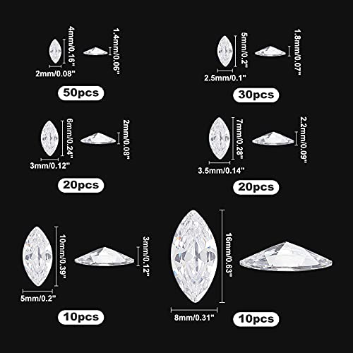 6 taglie disponibili: il pacchetto include cabochon in zirconi cubici in 6 taglie - lunghezza 4 mm (50 pezzi), 5 mm (30 pezzi), 6 mm (20 pezzi), 7 mm (20 pezzi), 10 mm (10 pezzi) e 16 mm (10 pezzi).