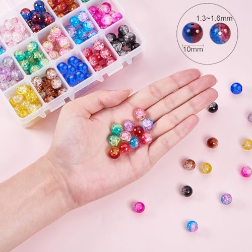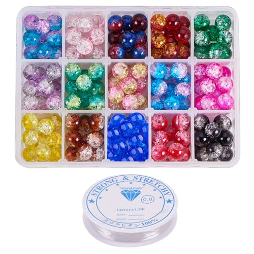 PandaHall Elite Circa 195pcs 15 Colore 10mm Rotondo Spray Verniciato Crackle Perline di Vetro Assortimento Lotto con Filo Elastico di Cristallo (0.8mm, 5m / Rotolo)