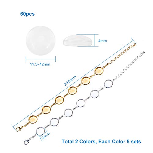 PandaHall Elite 10 Pezzi Bracciale in Ottone con Cabochons per Creare Bracciali Fai da Te, Rotondo Piatto, Argento & Oro, 9-5/8"(245 mm), Vassoio: 12 mm, 5 Corde/Scatola