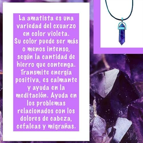 Ciondolo in pietra ametista, con una corda di filo nero. È uno dei quarzi più apprezzati per la sua tonalità. Il suo caratteristico colore viola è dovuto al suo alto contenuto di ossido di ferro.