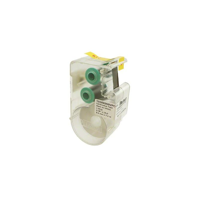 CASSETTA NASTRO L=7 6 M E H=9 7 MM La cassetta a nastro continuo include sia il materiale per etichette che il nastro per una facile sostituzione. La cassetta delle etichette contiene un dispositivo di memoria integrato per la formattazione automatica, il richiamo dell'ultima legenda utilizzata e il numero di etichette rimanenti nella cassetta. Da utilizzare con le stampanti LS8E e LS8EQ. Vinile. 0,38" x 25' (9,6 mm x 7,6 m). Colore Nero su bianco. 1 cassetta per confezione.