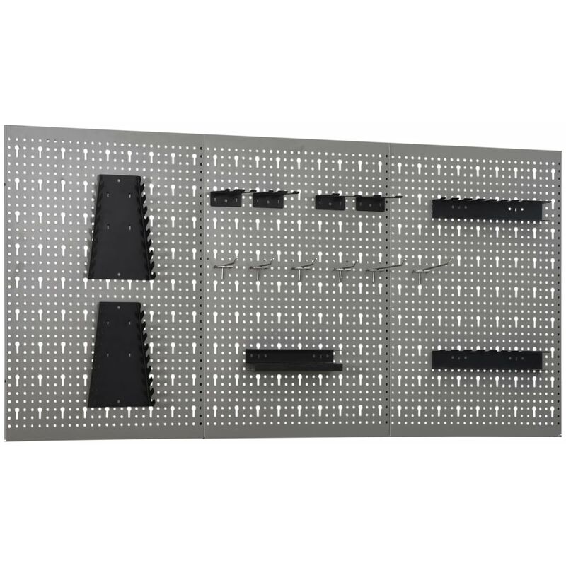 I nostri pannelli per attrezzi a parete mantengono i vostri strumenti organizzati e facilmente accessibili! Possono essere ampiamente utilizzati in officina, garage e per usi commerciali. Questi pannelli per utensili sono realizzati in acciaio robusto per sostenere il peso di vari strumenti, come trapani, pinze, cacciaviti e chiavi. I pannelli sono dotati di fori per fissare gli strumenti in modo facile e sicuro. I 3 pannelli a parete possono essere fissati insieme per offrire una maggiore rigidità. Costituiscono un'aggiunta ideale al banco da lavoro e agli armadietti da officina con una larghezza di 120 cm. Colore: Grigio Materiale: Acciaio Dimensioni (ciascuno): 40 x 58 x 1 cm (L x P x A) Spessore del metallo: 0,5 mm Diametro fori piccoli: 5,5 mm Dimensioni dei fori non rotondi: 9,4 x 22,5 mm (L x A) Fori versatili Adatto per banco da lavoro da 120 cm La consegna include:: 3 Pannelli forati 15 Accessori di montaggio SKU: 145351