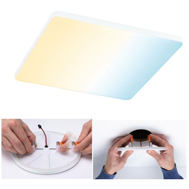 Pannello di installazione a LED Varifit Veluna Edge - IP44 Corner 200x200mm 1400lm Dimmibile bianco bianco sintonizzabile Il pannello angolare Veluna Varifit Edge si convince con un design moderno e senza cornice. Il pannello con una dimensione di 200x200 mm garantisce un'uscita leggera elevata. Grazie alla tecnologia Varifit flessibile, le molle di serraggio per l'installazione possono essere continuamente impostate tra 68 e 180 mm. Ciò consente di installare il pannello sia in bowhole esistenti che nuovi. Con un diametro del foro di 68 mm, è richiesta una profondità di cavità di 30 mm. La copertura di plastica satinata crea una dispersione di luce fine. Con il controllo della luce bianca bianca sintonizzabile, è possibile regolare il colore della luce del luminaire singolarmente e continuamente - dalla luce di lavoro bianco alla luce diurna alla luce del rilassamento bianco caldo. La lampada è compatibile con Zigbee 3.0. Zigbee è un protocollo di trasmissione radio che collega