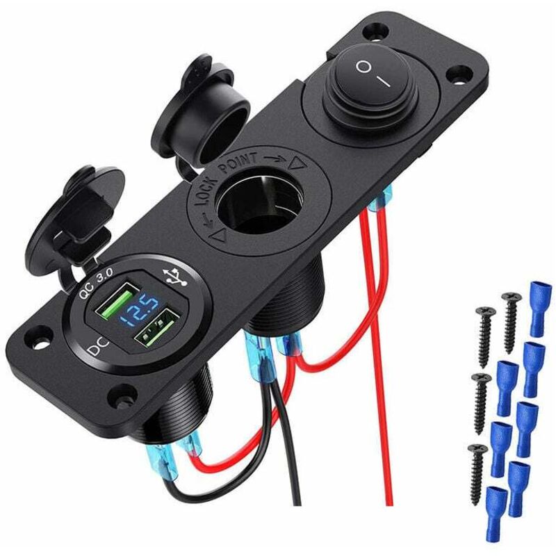 Porte di ricarica USB Il caricabatterie USB per auto QC3.0 ha due porte di ricarica QC3.0 da 30 W, la porta offre la massima efficienza di ricarica fino a 1000 W. 80% in 35 minuti, 4 volte più veloce del normale caricabatterie. . Presa per accendisigari Una presa per accendisigari può fornire alimentazione a 12 V CC e caricare una dash cam, GPS, sedile riscaldato, aspirapolvere, umidificatore per auto, pompa dell'aria, purificatore d'aria, ecc. . Visualizzazione tensione LED La funzione di monitoraggio della tensione LED digitale consente di monitorare lo stato della batteria e dell'impianto elettrico del veicolo in tempo reale. . Interruttore di alimentazione Pannello prese USB aggiornato progettato con un interruttore on/off per risparmiare energia, proteggere i dispositivi e aumentarne la durata. Mantiene l'elettricità e non consuma energia quando si spegne. . Fusibile da 10 A Protegge i tuoi dispositivi da sovracorrente, sovraccarico, surriscaldamento, sovratensione, sottotensione