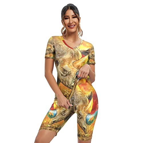 Set di pantaloncini da donna a due pezzi per uso quotidiano, con animali rinoceronte dorato, yoga e allenamento a maniche corte con scollo a V e pantaloni, Multicolore, S