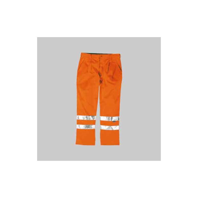 Tessuto 65% cotone e 35% poliestere, peso 210 g/mý. Due bande retroriflettenti orizzontali che avvolgono entrambe le gambe. Chiusura frontale con bottone e cerniera ricoperta da patta, passanti in vita. Due tasche anteriori, tasca porta metro, tasca posteriore con bottone. Pantalone alta visibilita' tg. l - col. giallo Abbigliamento alta visibilita'