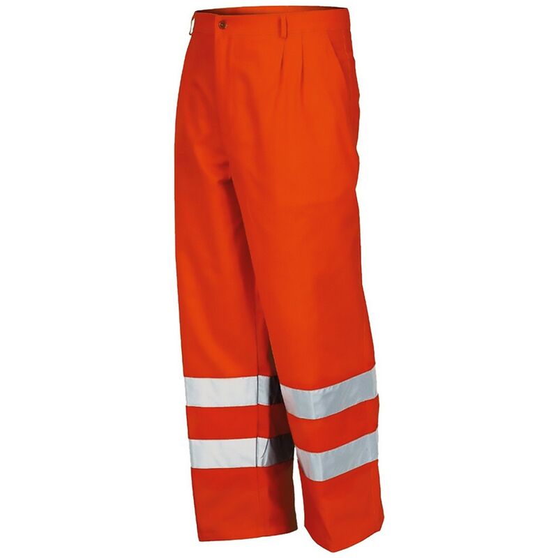 In 60% cotone, 40% poliestere, peso 350 gr/mq fustagno. bande retroriflettenti. con 1 tasca posteriore con bottone, 1 tasca portametro, 2 tasche anteriori a filetto. chiusura patta con bottoni coperti. a norma uni en iso 13688:2013 - 20471:2013.l