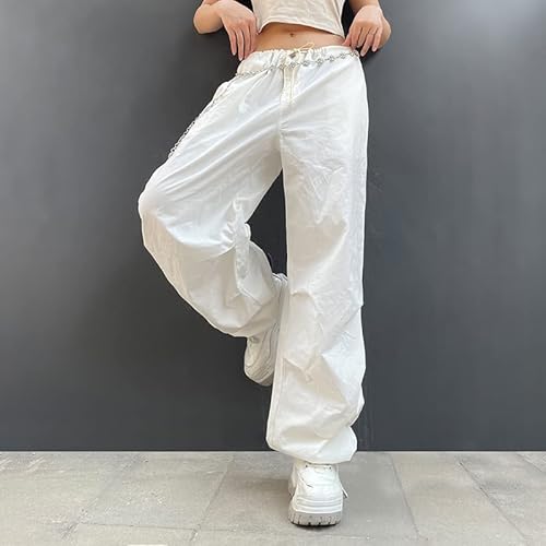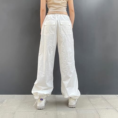 Pantaloni cargo larghi casual da donna tinta unita elastico in vita con lacci tasche laterali allentati gamba larga Jogger pantaloni lunghi Harajuku Punk Hipster, bianco, S
