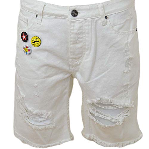 Pantoloni Corti Short Uomo Bermuda in Denim Jeans Bianco con Strappi e Stemmi Frontali Moda Giovane (42 EU)