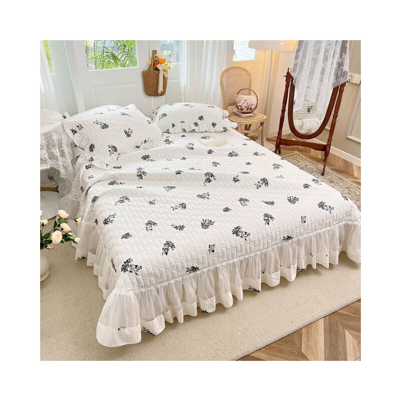 100% cotton material,13372 densityQuilting technicsLace ruffle edgeQueen: 1pcs bedspread:250x250cm(98x98inch)2pcs pillowcases:48x74cm(18x29inch) King: 1pcs bedspread:250x270cm(98x106inch)2pcs pillowcases:48x74cm(18x29inch) Kindly ReminderSize 1-5cm error is allowableDuvet cover set without filler or pillow fillerWe will write low value for tax problemLong distance transport,the bedding is not so flat as pictureTight package,please be careful to open itWholesale & Drop Shipping Price for Reseller,contact US